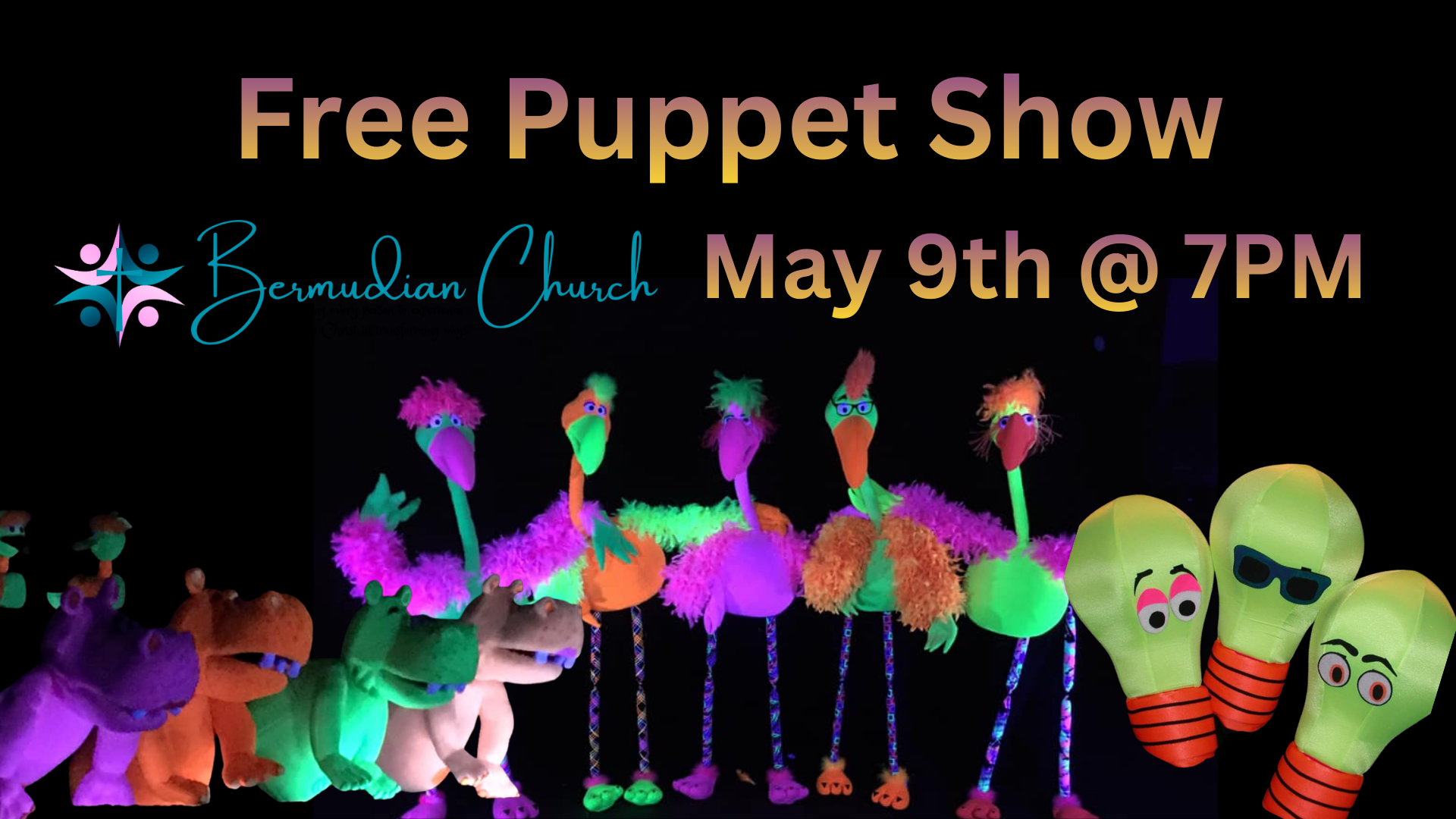 This great event is available to anyone of all ages at Bermudian Church. A group of youth and adults are sharing the good new of God through a fun and exciting show that brings one closer to God through puppetry and music. It will include many great Christian songs as we look forward to Saturday May 9th. The show begins at 7PM in the Gathering place. Please join us as we have fun together.