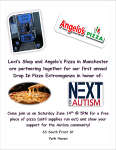 Lexi’s Shop and Angelo’s Pizza in Manchester are partnering together for our first annual Drop In Pizza Extravaganza for NEXT for Autism!