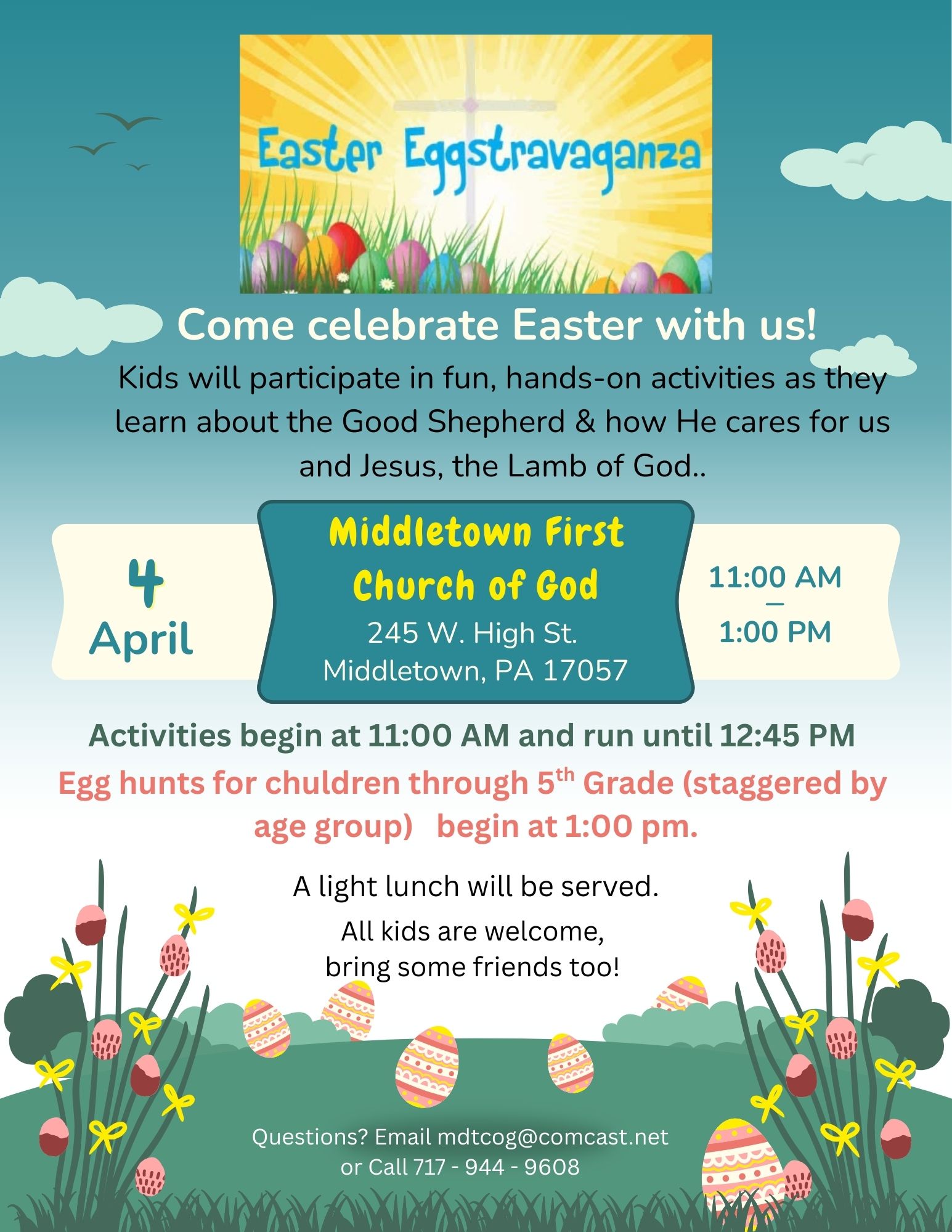 Saturday April 4-come celebrate Easter with us at Middletown First Church of God! Kids will participate in fun, hands-on activities as they learn about our Lord, the Good Shepherd, and how He cares for us and the sacrifice of the Lamb of God for all of us. Activities/stations begin at 11:00 am & run continuously until 12:45 pm. Egg hunts for children through 5th grade (divided by age group) begin at 1:00 with the youngest ones. The next age group will follow approx. 5-10 minutes later to allow for parents with multiple children attending. Please bring a basket or other container for the egg hunt. A light lunch will be served. All are welcome, bring some friends too.