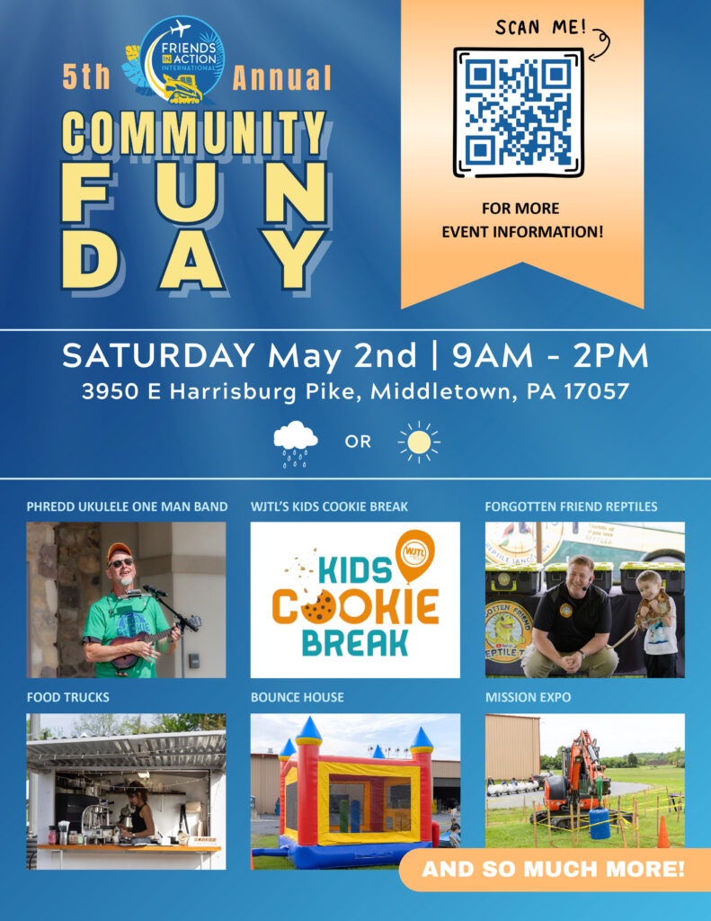 Join the fun at the 5th Annual Community Fun Day and Mission Expo presented by Friends in Action! From 9 am to 2 pm on May 2nd, 2026. This family event will welcome WJTL’s Kids Cookie Break. Plus, see Forgotten Friend Reptile Show, Phredd the One Man Band, a bounce house, candy cannon, barrel train ride, construction and excavating equipment, and more! With a special focus on international missions, you can experience the tangible ways FIA ministers to lost and unreached people! From a hand water pump to kid-friendly activities and crafts, and the Mission Expo, it all relates to how we serve communities across the world.