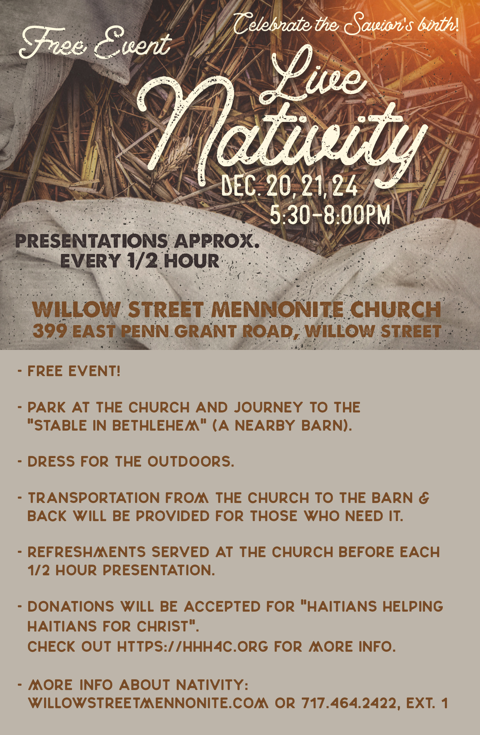 Willow Street Mennonite Church invites you to our Live Nativity on December 20, 21 and 24. Park at the church and journey with us outdoors to the stable in Bethlehem (a nearby barn). Presentations are approximately every ½ hour 5:30-8:00pm. This is a free event, but donations will be accepted for “Haitians Helping Haitians for Christ”. For more information, visit https://www.willowstreetmennonite.com/ or call 717-464-2422, ext. 1.