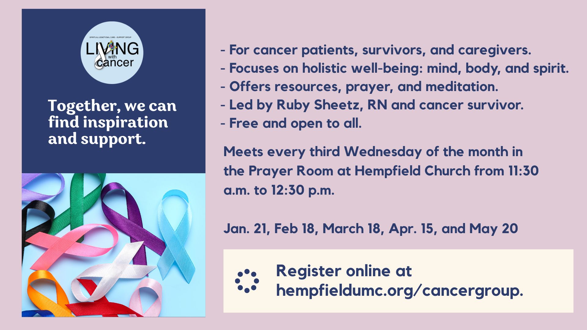 The group provides holistic support through education, tools, resources, prayer, and meditation. Led by Ruby Sheetz, Registered Nurse and cancer survivor, this faith-based group emphasizes hope and health. Topics include maintaining a positive attitude, self-care, and seeking support from others.