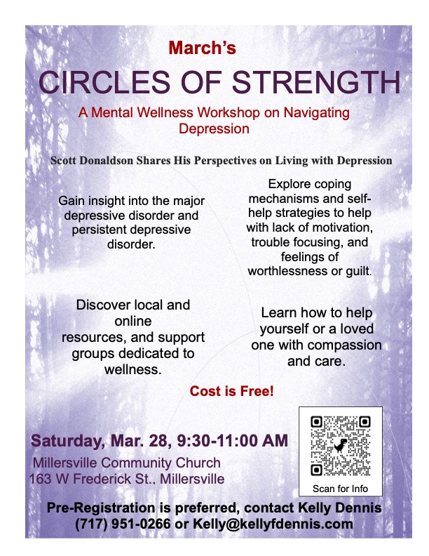 If you or a loved one are struggling, or if you just want to learn more about depression, Join us for a free Mental Wellness Workshop on Saturday, March 28th @ Millersville Community Church. If you’re not local to Millersville, you may still join via Zoom. Please contact kelly@kellyfdennis.com for the registration link.