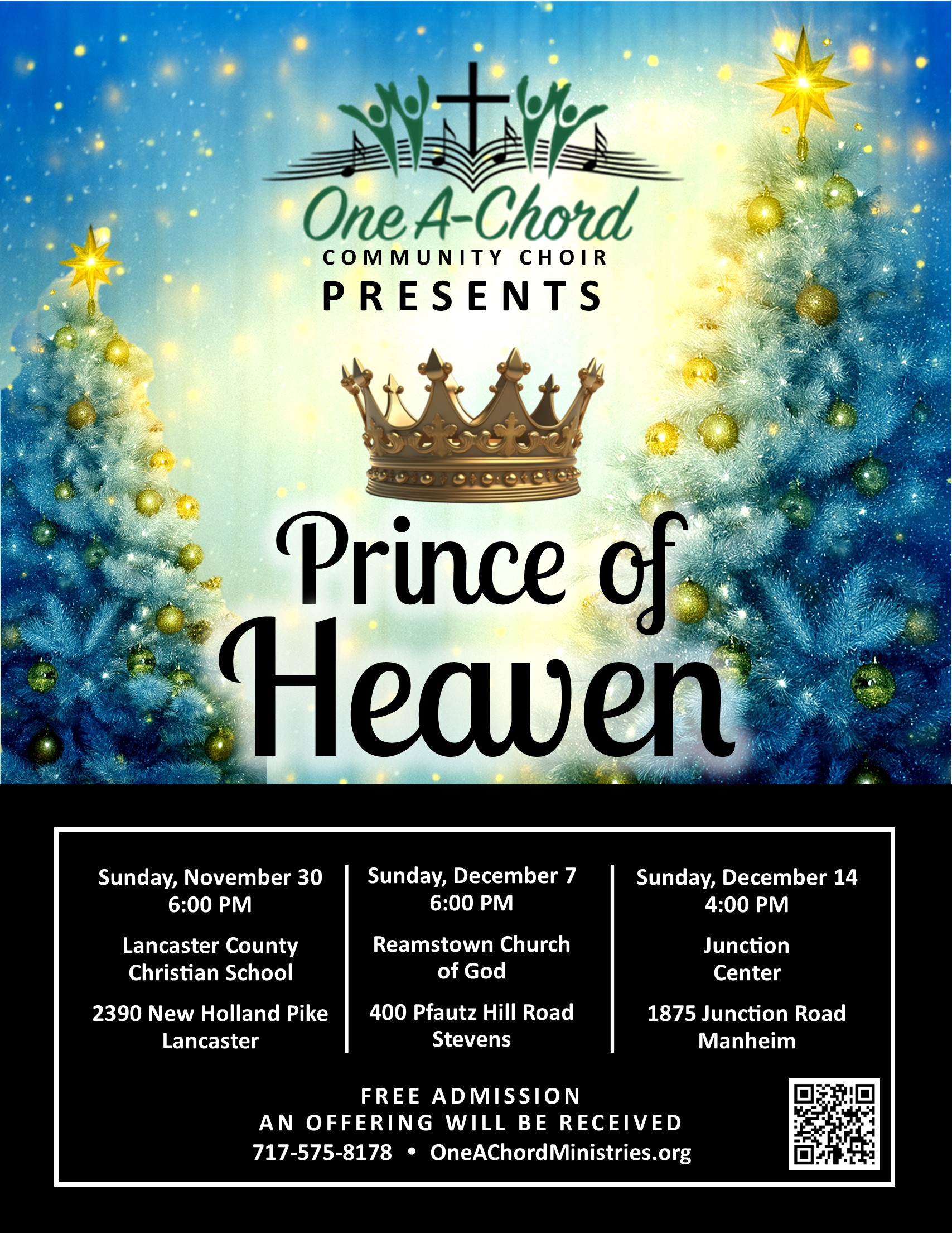 ONE A-CHORD Community Choir presents “Prince of Heaven” – a concert of Christmas worship and familiar favorites, celebrating the “Reason for the Season”.