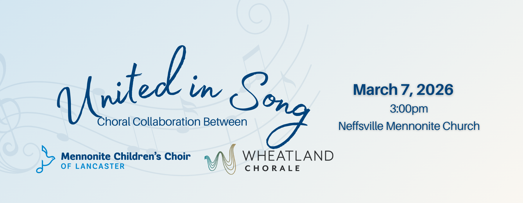 The Mennonite Children’s Choir of Lancaster and the Wheatland Chorale will join together for the first time in a special intergenerational concert, United in Song, on Saturday, March 7, 2026, at 3:00 p.m. at Neffsville Mennonite Church. This unique program brings together singers in grades 6–12 with experienced adult vocalists to celebrate the power of music across generations. A free‑will offering will support both choirs, with a focus on MCCL tuition assistance so that young singers of all backgrounds can participate.