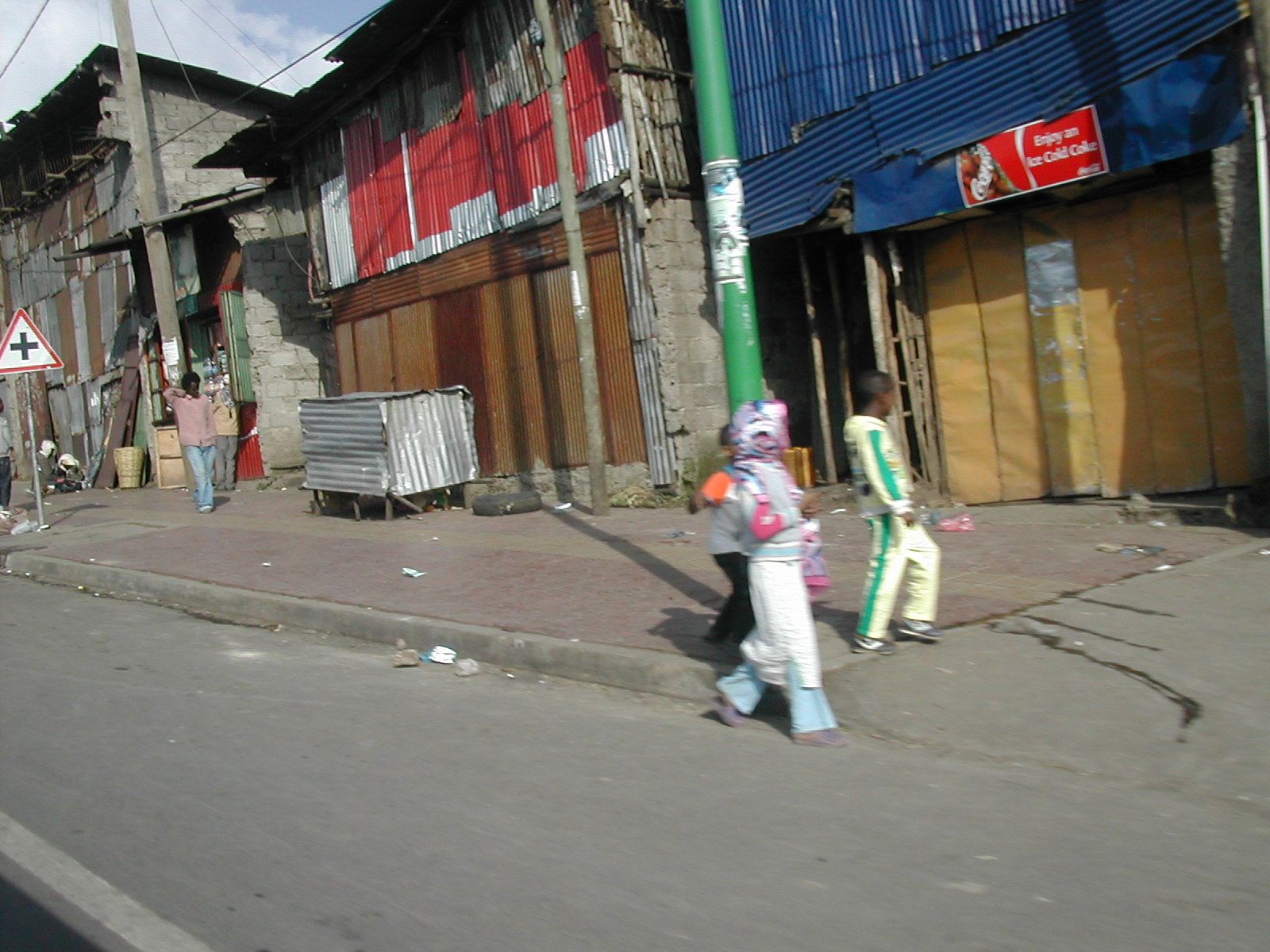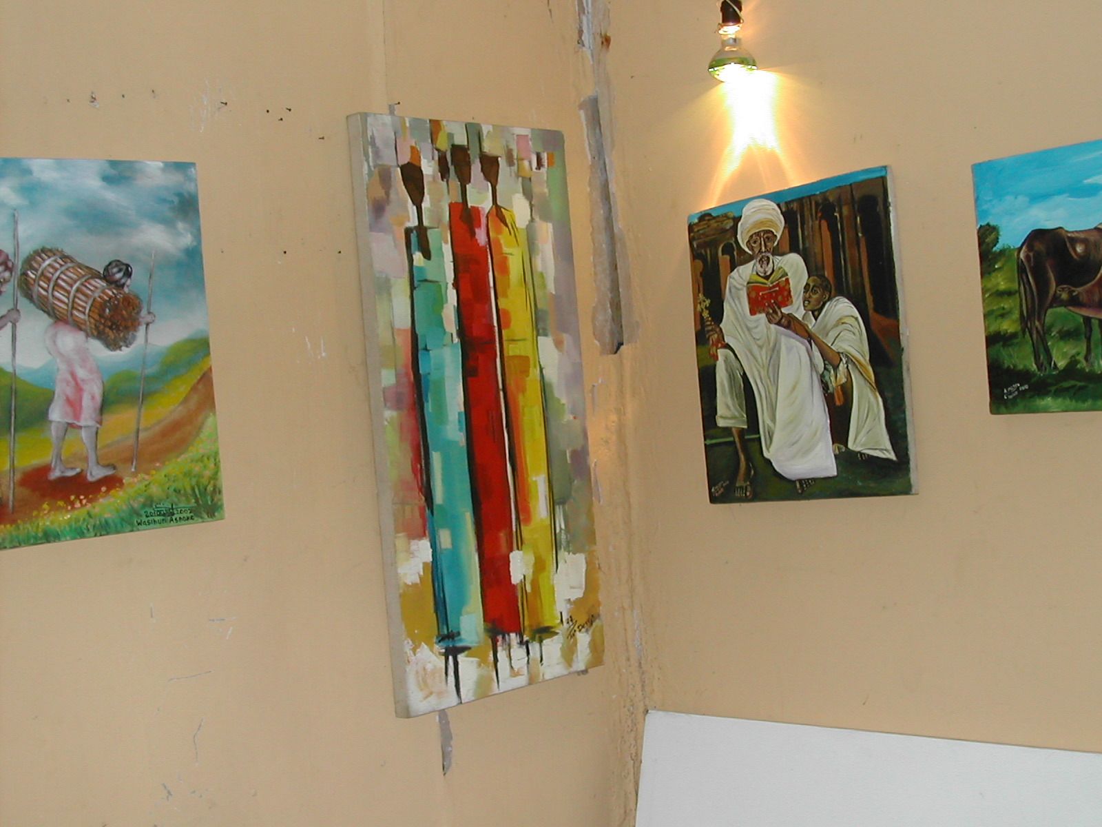 In the pictures below you will see views from Ntoto (you can see the heavy fog over the city), an art gallery with beautiful cultural paintings that was in a shack at the top of the mountain, and sites we saw as we drove through the marketplace and the city. There were eucalyptus plants in the woods on Mt. Ntoto that smelled amazing when you squished the leaves between your fingers. There were children that followed us while we wandered around on the mountain. They were VERY diligent in trying to find ways to get money from us and unfortunately I couldn’t take the picture of the following (because they would have wanted me to pay them for it): they were very creatively “skateboarding” and sliding down the road on a piece of a smashed up plastic bottle. There were also women carrying bundles of sticks they had gathered. Many many people approached the van asking for money including a group of children who sang lines from the chorus “This is the Day” and then said “no program”. Wow, that was tough for me.
