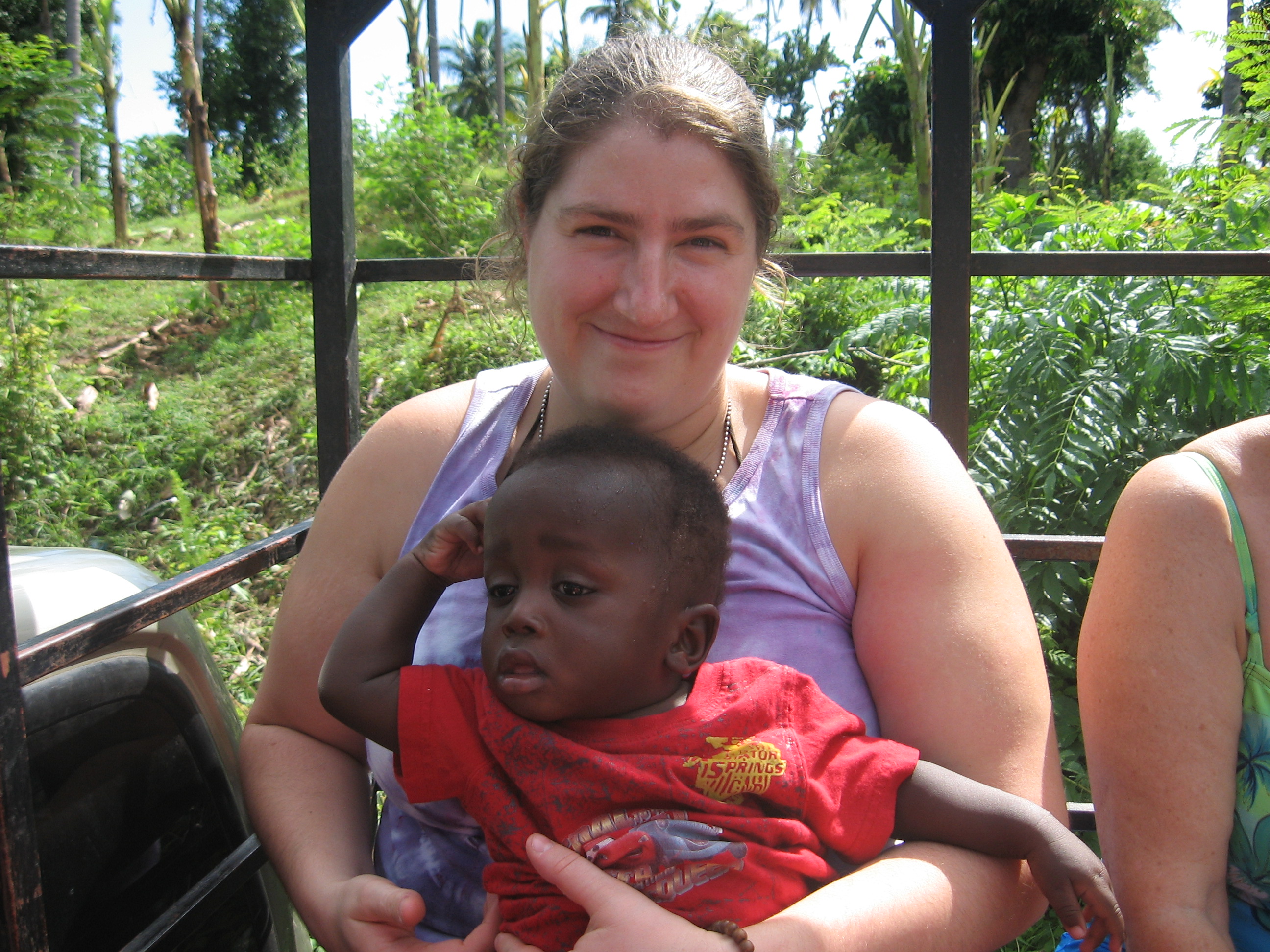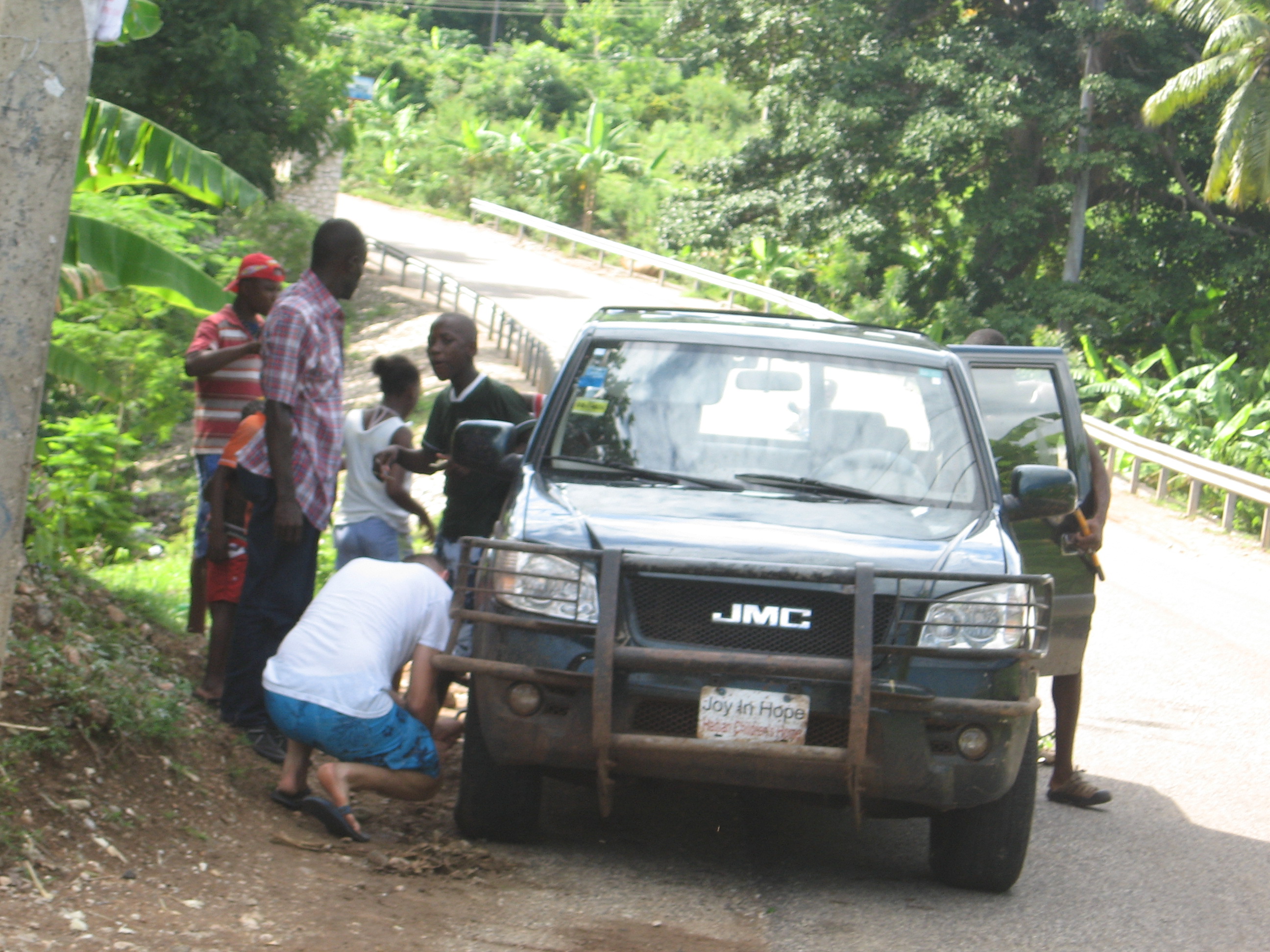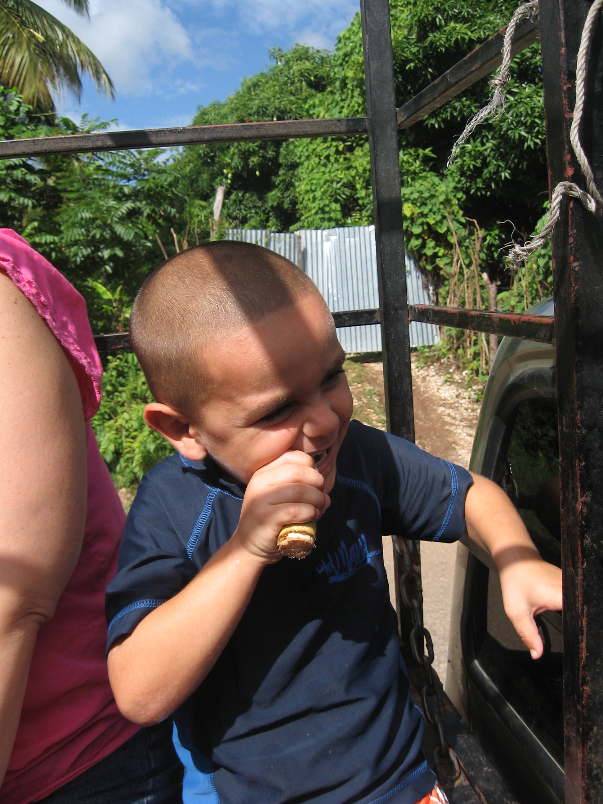 After a delicious lunch made by the staff at the Isaiah house, we headed to Raymond beach. The weather in Haiti changes quickly and our rainy day turned gorgeous! We piled in the tap taps … I chose to ride in the back and it was really fun (and windy). On our way, one of the vehicles had a flat tire that was quickly changed by Nick and Hughes while the children enjoyed some sugar cane. With the conditions of the roads around here I would guess this is not an unusual thing for them.