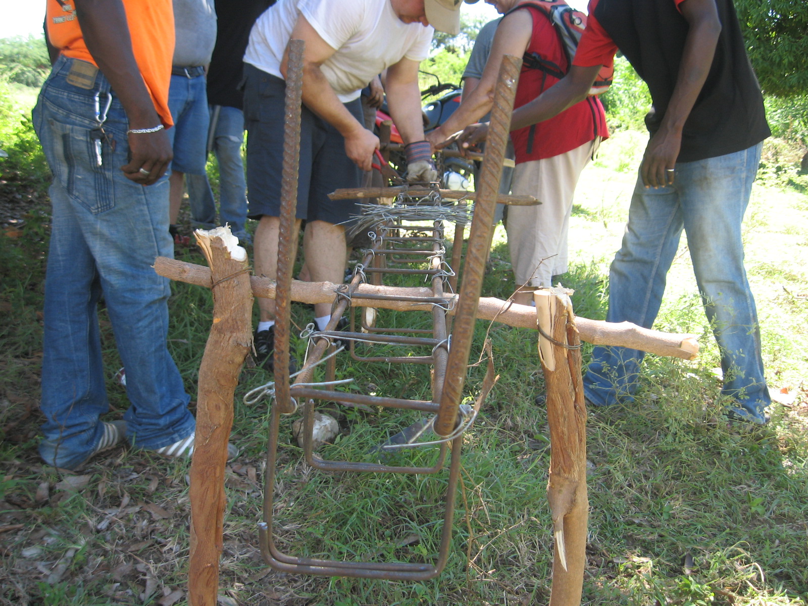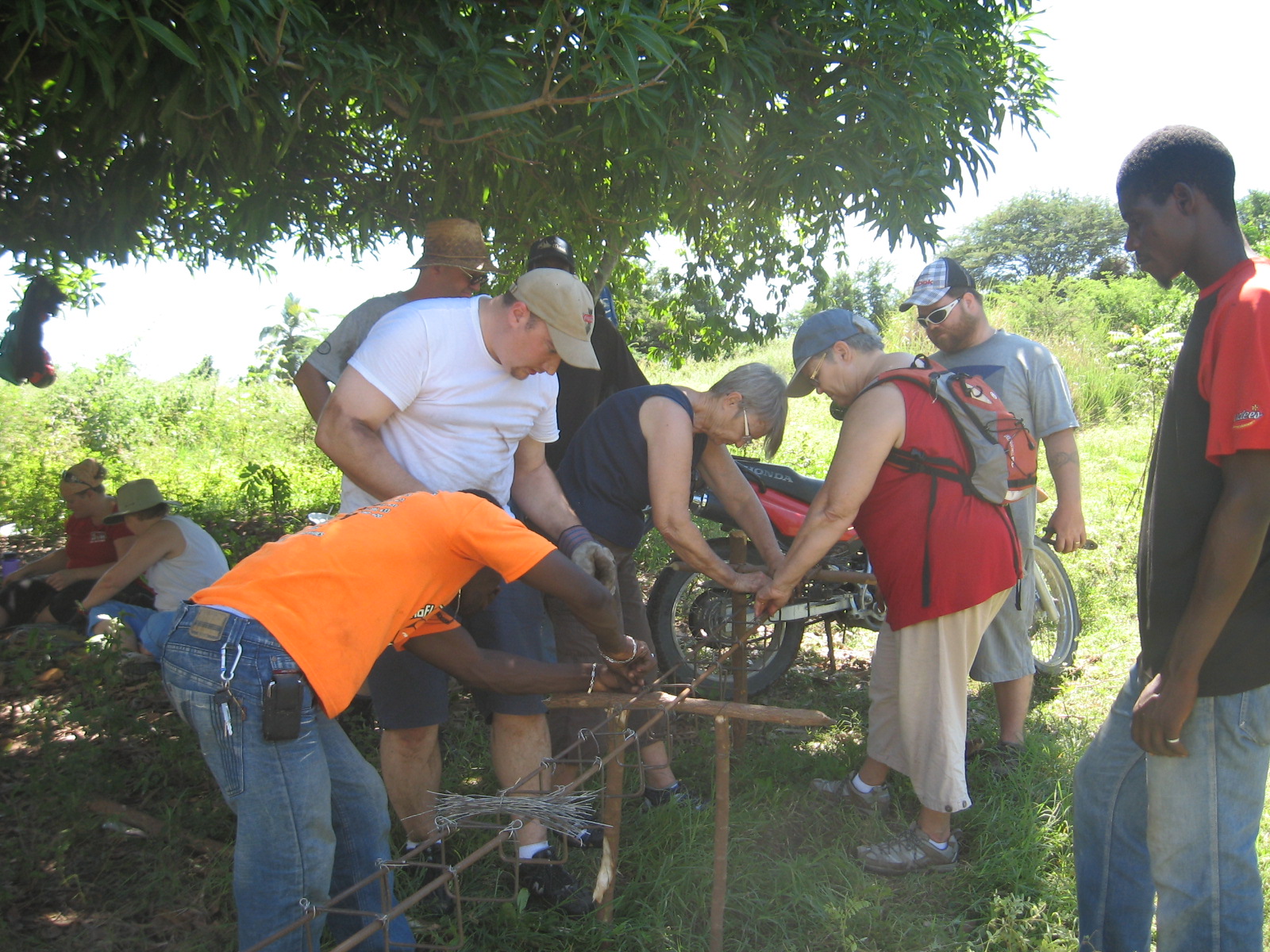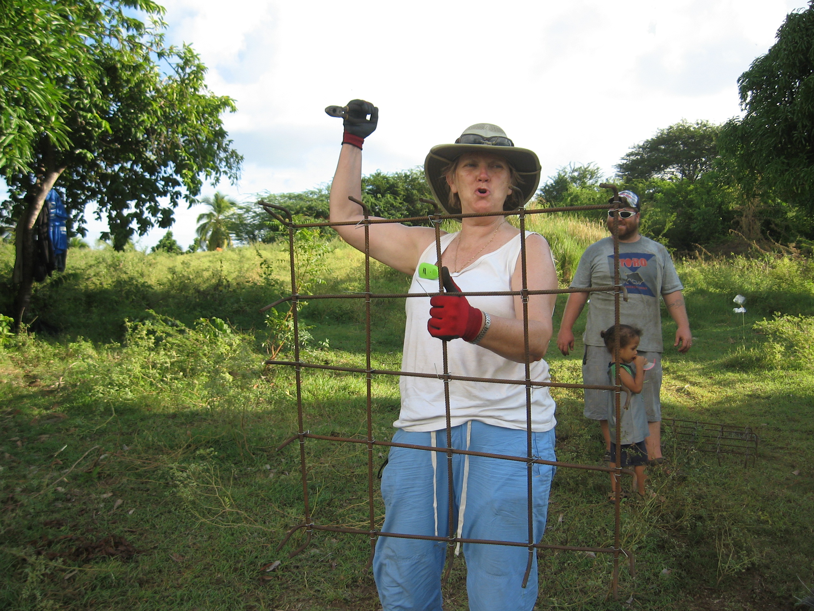 The men had the project underway having leveled and dug out the foundation. When we arrived we were put to work bending, cutting and tying metal and assembling posts that will serve as structure for the house. Mike and Georgette, the Directors of Development for Joy in Hope and some hired crew leaders gave us instruction and patiently re-directed people like me who are not so used to construction work. 🙂 We had fun joking around while sweating and trying to stay hydrated!