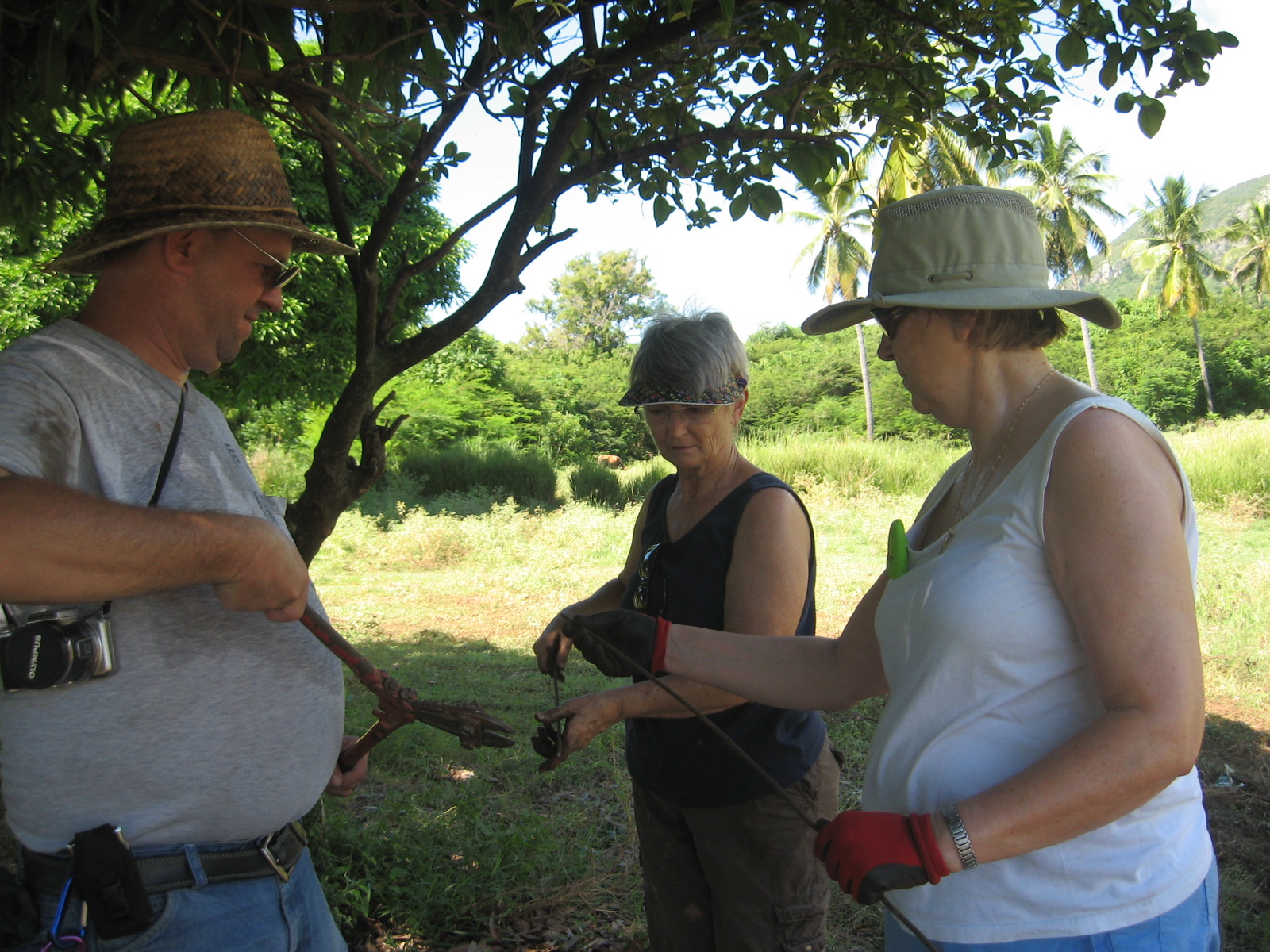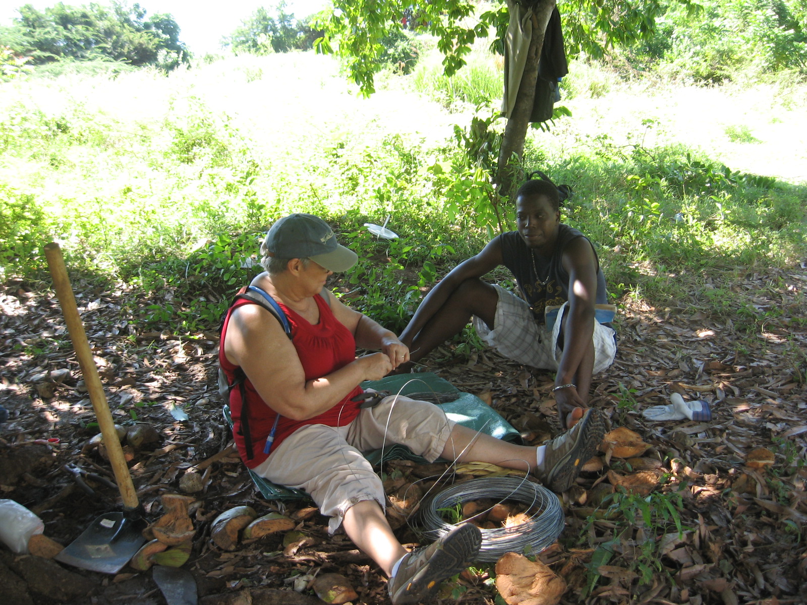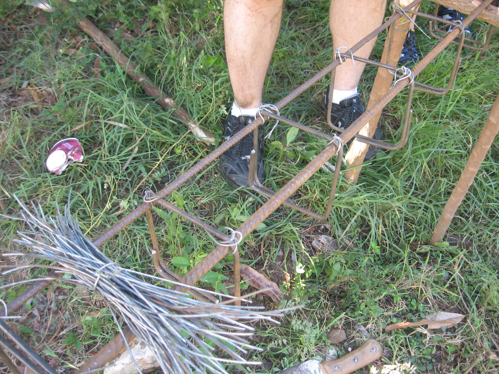The men had the project underway having leveled and dug out the foundation. When we arrived we were put to work bending, cutting and tying metal and assembling posts that will serve as structure for the house. Mike and Georgette, the Directors of Development for Joy in Hope and some hired crew leaders gave us instruction and patiently re-directed people like me who are not so used to construction work. 🙂 We had fun joking around while sweating and trying to stay hydrated!