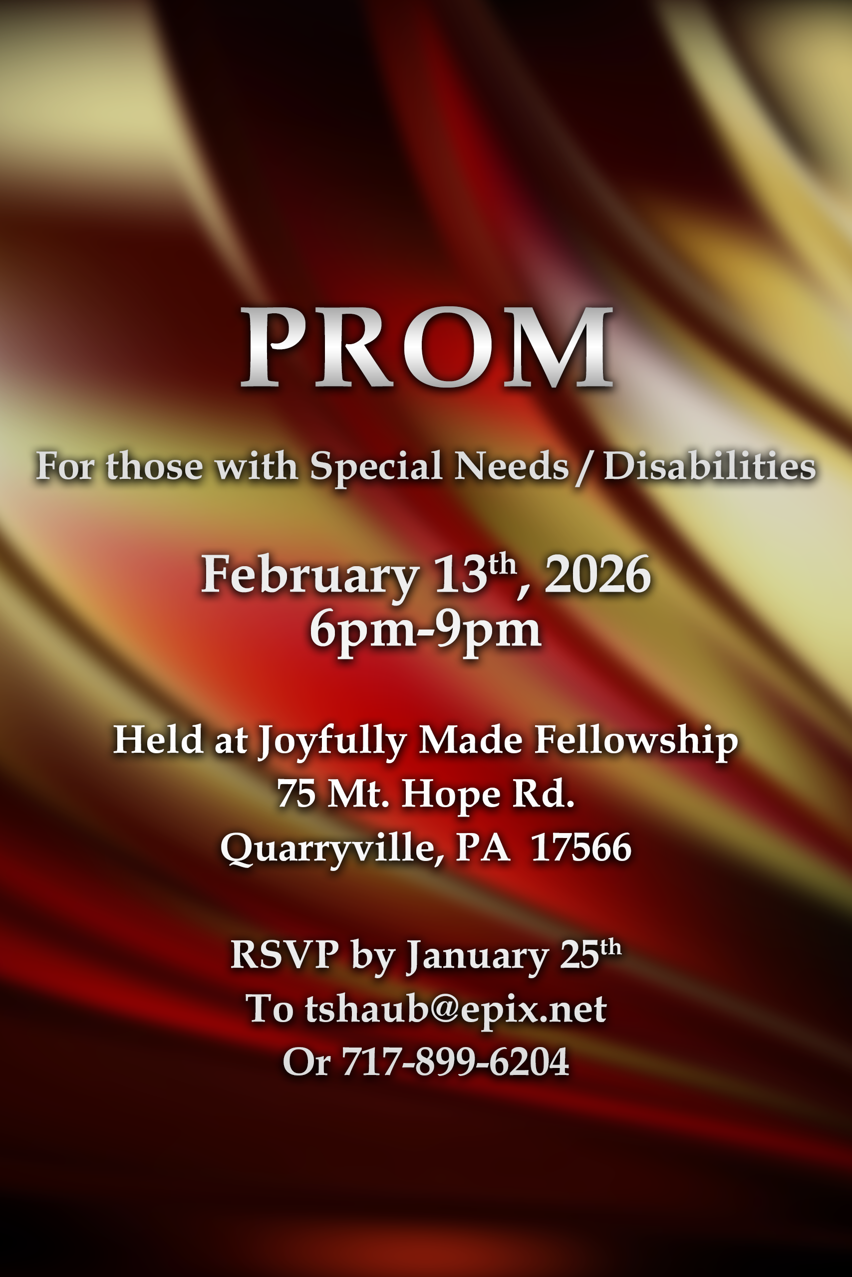 Joyfully Made Fellowship 75 Mt. Hope Rd., Quarryville, PA, United StatesJoyfully Made Fellowship is hosting a Prom for those with Special Needs/Disabilities on February 13, 2026 from 6-9pm. We will have dinner, dancing, karaoke, crafts, games and more. Space is limited. Registration required to tshaub@epix.net by January 25, 2026.